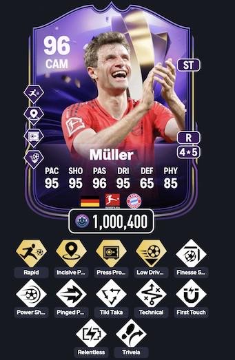 EA官方在今夜凌晨上線了時代終結托馬斯-穆勒,共需要13套陣容制作。    該張卡的金技能為跑步,直塞,低射,保險箱。銀技能為搓射、大力射門、大力短傳、TikiTaka、游龍、磁鐵、電池、外腳背。 穆勒在拜仁慕尼黑的職業(yè)生涯堪稱傳奇,他幫助球隊贏得了13次德甲冠軍、6次德國杯、2次歐冠冠軍以及2次世俱杯冠軍。 在2019-20賽季,他以21次助攻打破德甲單賽季紀錄,幫助拜仁實現(xiàn)聯(lián)賽、杯賽和歐冠的“三冠王”。  |