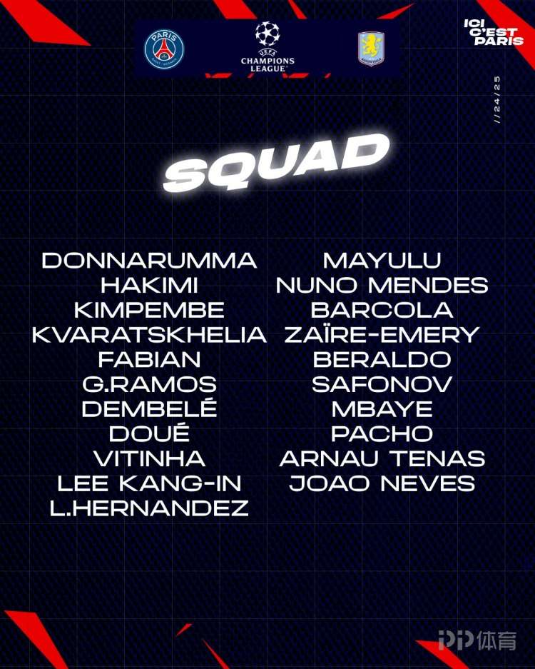 巴黎對陣維拉名單:登貝萊、K77領(lǐng)銜 馬爾基尼奧斯停賽