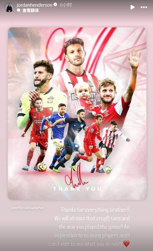 北京時(shí)間6月25日,37歲拉拉納宣布自己將結(jié)束職業(yè)生涯,隨后,亨德森在社交媒體上發(fā)表動(dòng)態(tài),向自己的老隊(duì)友送上了祝福。 ![]() 亨德森轉(zhuǎn)發(fā)了拉拉納退役的海報(bào),并配文:“感謝你所做的一切,兄弟!我們都會(huì)懷念你那標(biāo)志性的克魯伊夫轉(zhuǎn)身和你在比賽中的表現(xiàn)!你是許多球員的靈感來(lái)源,我迫不及待想看到你接下來(lái)會(huì)有什么新動(dòng)作!” 拉拉納在12歲加入南安普頓青訓(xùn),2006年升入一線隊(duì)并完成首秀,2014年夏天,他轉(zhuǎn)會(huì)加盟利物浦,之后隨利物浦奪得過(guò)英超冠軍、歐冠冠軍等榮譽(yù),2020年夏天自由轉(zhuǎn)會(huì)加盟布萊頓,去年夏天自由身回歸南安普頓。 |