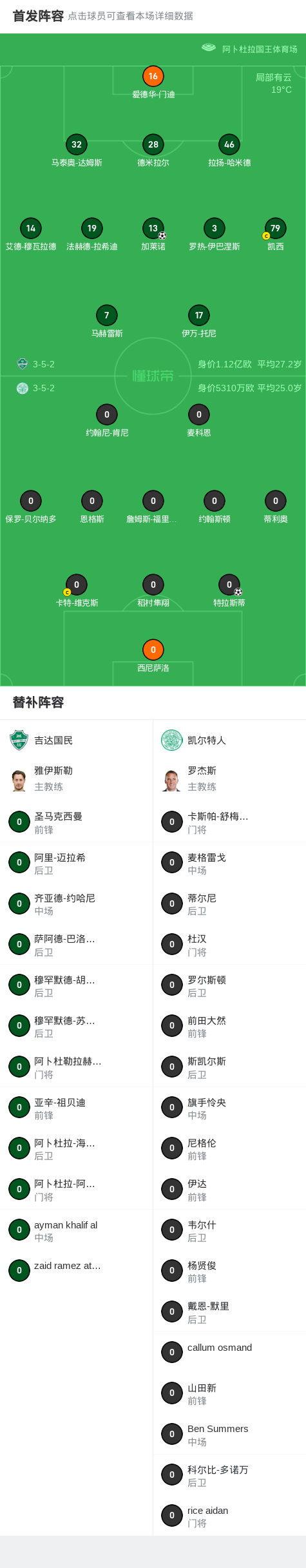 ![]() 北京時間7月27日進行的一場俱樂部友誼賽中,吉達國民與凱爾特人 對決。比賽中,吉達國民球員加萊諾率先打破僵局,隨后凱爾特人球員特拉斯蒂成功將比分扳平。最終雙方以1比1握手言和。 精彩瞬間 第23分鐘,吉達國民球員加萊諾打入一球。 第50分鐘,凱爾特人球員特拉斯蒂打入一球。 球隊陣容 ![]() 技術(shù)統(tǒng)計 ![]() |