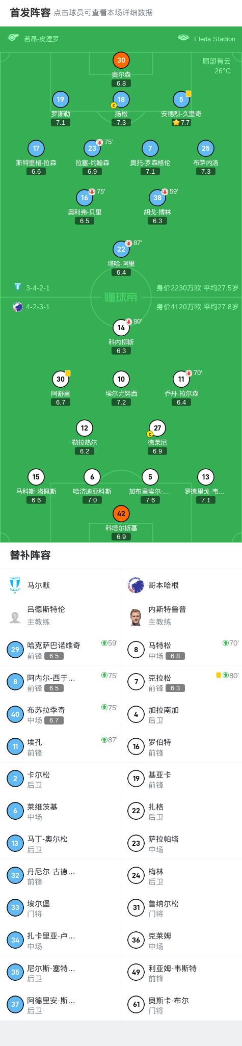 北京時間8月6日,歐洲冠軍聯(lián)賽資格賽第三輪首回合,馬爾默與哥本哈根 較量。全場比賽結束,雙方以0-0握手言和。 球隊陣容 技術統(tǒng)計 ![]() |