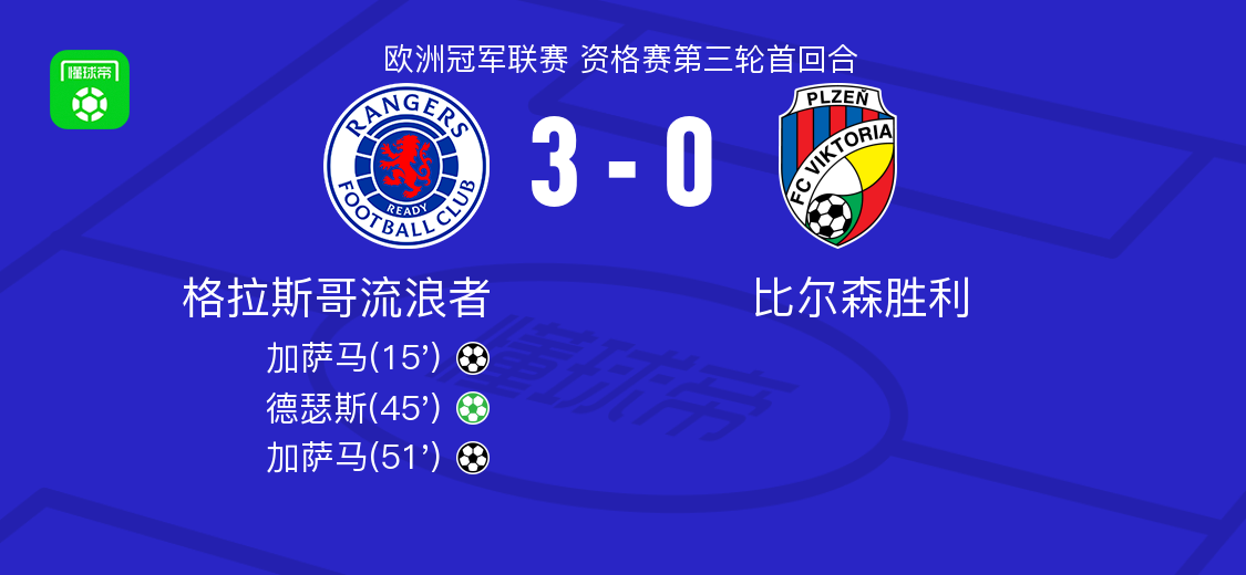 格拉斯哥流浪者3-0大勝比爾森勝利,加薩馬雙響,德瑟斯傳射