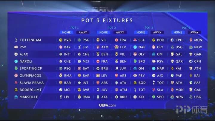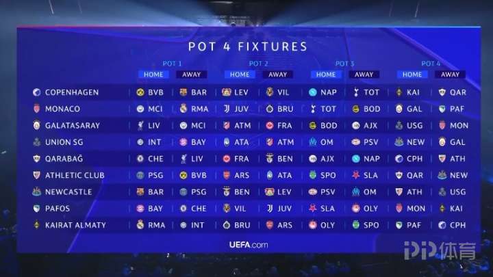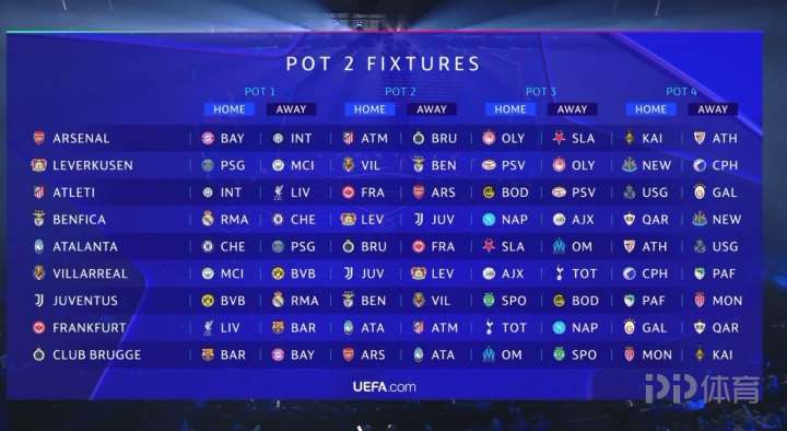 25-26賽季歐冠聯(lián)賽抽簽結(jié)果出爐,皇馬、布魯日、奧林匹亞科斯、帕福斯4隊(duì)將客戰(zhàn)哈薩克斯坦球隊(duì)凱拉特,阿諾德、德布勞內(nèi)等球員將會(huì)各自對(duì)陣舊主。 ![]() 完整對(duì)陣詳情如下: 第一檔: 巴黎圣日耳曼對(duì)手:拜仁慕尼黑(主)、巴塞羅那(客)、亞特蘭大(主)、勒沃庫(kù)森(客)、熱刺(主)、葡萄牙體育(客)、紐卡斯?fàn)柭?lián)(主)、畢爾巴鄂競(jìng)技(客) 皇家馬德里對(duì)手:曼城(主)、利物浦(客)、尤文圖斯(主)、本菲卡(客)、馬賽(主)、奧林匹亞科斯(客)、摩納哥(主)、阿拉木圖凱拉特(客) 曼城對(duì)手:多特蒙德(主)、皇家馬德里(客)、勒沃庫(kù)森(主)、比利亞雷亞爾(客)、那不勒斯(主)、博德閃耀(客)、加拉塔薩雷(主)、摩納哥(客) 拜仁慕尼黑對(duì)手:切爾西(主)、巴黎圣日耳曼(客)、布魯日(主)、阿森納(客)、葡萄牙體育(主)、埃因霍溫(客)、圣吉羅斯(主)、帕福斯(客) 利物浦對(duì)手:皇家馬德里(主)、國(guó)際米蘭(客)、馬德里競(jìng)技(主)、法蘭克福(客)、埃因霍溫(主)、馬賽(客)、卡拉巴赫(主)、加拉塔薩雷(客) 國(guó)際米蘭對(duì)手:利物浦(主)、多特蒙德(客)、阿森納(主)、馬德里競(jìng)技(客)、布拉格斯拉維亞(主)、阿賈克斯(客)、阿拉木圖凱拉特(主)、圣吉羅斯(客) 切爾西對(duì)手:巴塞羅那(主)、拜仁慕尼黑(客)、本菲卡(主)、亞特蘭大(客)、阿賈克斯(主)、那不勒斯(客)、帕福斯(主)、卡拉巴赫(客) 多特蒙德對(duì)手:國(guó)際米蘭(主)、曼城(客)、比利亞雷亞爾(主)、尤文圖斯(客)、博德閃耀(主)、熱刺(客)、畢爾巴鄂競(jìng)技(主)、哥本哈根(客) 巴塞羅那對(duì)手:巴黎圣日耳曼(主)、切爾西(客)、法蘭克福(主)、布魯日(客)、奧林匹亞科斯(主)、布拉格斯拉維亞(客)、哥本哈根(主)、紐卡斯?fàn)柭?lián)(客) ![]() 第二檔: 阿森納對(duì)手:拜仁慕尼黑(主)、國(guó)際米蘭(客)、馬德里競(jìng)技(主)、布魯日(客)、奧林匹亞科斯(主)、布拉格斯拉維亞(客)、阿拉木圖凱拉特(主)、畢爾巴鄂競(jìng)技(客) 勒沃庫(kù)森對(duì)手:巴黎圣日耳曼(主)、曼城(客)、比利亞雷亞爾(主)、本菲卡(客)、埃因霍溫(主)、奧林匹亞科斯(客)、紐卡斯?fàn)柭?lián)(主)、哥本哈根(客) 馬德里競(jìng)技對(duì)手:國(guó)際米蘭(主)、利物浦(客)、法蘭克福(主)、阿森納(客)、博德閃耀(主)、埃因霍溫(客)、圣吉羅斯(主)、加拉塔薩雷(客) 本菲卡對(duì)手:皇家馬德里(主)、切爾西(客)、勒沃庫(kù)森(主)、尤文圖斯(客)、那不勒斯(主)、阿賈克斯(客)、卡拉巴赫(主)、紐卡斯?fàn)柭?lián)(客) 亞特蘭大對(duì)手:切爾西(主)、巴黎圣日耳曼(客)、布魯日(主)、法蘭克福(客)、布拉格斯拉維亞(主)、馬賽(客)、畢爾巴鄂競(jìng)技(主)、圣吉羅斯(客) 比利亞雷亞爾對(duì)手:曼城(主)、多特蒙德(客)、尤文圖斯(主)、勒沃庫(kù)森(客)、阿賈克斯(主)、熱刺(客)、哥本哈根(主)、帕福斯(客) 尤文圖斯對(duì)手:多特蒙德(主)、皇家馬德里(客)、本菲卡(主)、比利亞雷亞爾(客)、葡萄牙體育(主)、博德閃耀(客)、帕福斯(主)、摩納哥(客) 法蘭克福對(duì)手:利物浦(主)、巴塞羅那(客)、亞特蘭大(主)、馬德里競(jìng)技(客)、熱刺(主)、那不勒斯(客)、加拉塔薩雷(主)、卡拉巴赫(客) 布魯日對(duì)手:巴塞羅那(主)、拜仁慕尼黑(客)、阿森納(主)、亞特蘭大(客)、馬賽(主)、葡萄牙體育(客)、摩納哥(主)、阿拉木圖凱拉特(客) ![]() 第三檔: 馬賽對(duì)手:利物浦(主)、皇家馬德里(客)、亞特蘭大(主)、布魯日(客)、阿賈克斯(主)、葡萄牙體育(客)、紐卡斯?fàn)柭?lián)(主)、圣吉羅斯(客) 熱刺對(duì)手:多特蒙德(主)、巴黎圣日耳曼(客)、比利亞雷亞爾(主)、法蘭克福(客)、布拉格斯拉維亞(主)、博德閃耀(客)、哥本哈根(主)、摩納哥(客) 博德閃耀對(duì)手:曼城(主)、多特蒙德(客)、尤文圖斯(主)、馬德里競(jìng)技(客)、熱刺(主)、布拉格斯拉維亞(客)、摩納哥(主)、加拉塔薩雷(客) 葡萄牙體育對(duì)手:巴黎圣日耳曼(主)、拜仁慕尼黑(客)、布魯日(主)、尤文圖斯(客)、馬賽(主)、那不勒斯(客)、阿拉木圖凱拉特(主)、畢爾巴鄂競(jìng)技(客) 奧林匹亞科斯對(duì)手:皇家馬德里(主)、巴塞羅那(客)、勒沃庫(kù)森(主)、阿森納(客)、埃因霍溫(主)、阿賈克斯(客)、帕福斯(主)、阿拉木圖凱拉特(客) 阿賈克斯對(duì)手:國(guó)際米蘭(主)、切爾西(客)、本菲卡(主)、比利亞雷亞爾(客)、奧林匹亞科斯(主)、馬賽(客)、加拉塔薩雷(主)、卡拉巴赫(客) 布拉格斯拉維亞對(duì)手:巴塞羅那(主)、國(guó)際米蘭(客)、阿森納(主)、亞特蘭大(客)、博德閃耀(主)、熱刺(客)、畢爾巴鄂競(jìng)技(主)、帕福斯(客) 埃因霍溫對(duì)手:拜仁慕尼黑(主)、利物浦(客)、馬德里競(jìng)技(主)、勒沃庫(kù)森(客)、那不勒斯(主)、奧林匹亞科斯(客)、圣吉羅斯(主)、紐卡斯?fàn)柭?lián)(客) 那不勒斯對(duì)手:切爾西(主)、曼城(客)、法蘭克福(主)、本菲卡(客)、葡萄牙體育(主)、埃因霍溫(客)、卡拉巴赫(主)、哥本哈根(客) ![]() 第四檔: 畢爾巴鄂競(jìng)技對(duì)手:巴黎圣日耳曼(主)、多特蒙德(客)、阿森納(主)、亞特蘭大(客)、葡萄牙體育(主)、布拉格斯拉維亞(客)、卡拉巴赫(主)、紐卡斯?fàn)柭?lián)(客) 卡拉巴赫對(duì)手:切爾西(主)、利物浦(客)、法蘭克福(主)、本菲卡(客)、阿賈克斯(主)、那不勒