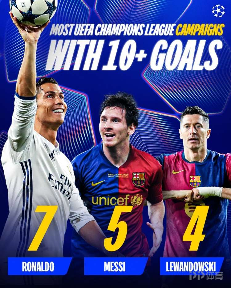 歐冠官方海報:萊萬4次單賽季歐冠進球上雙 C羅7次梅西5次