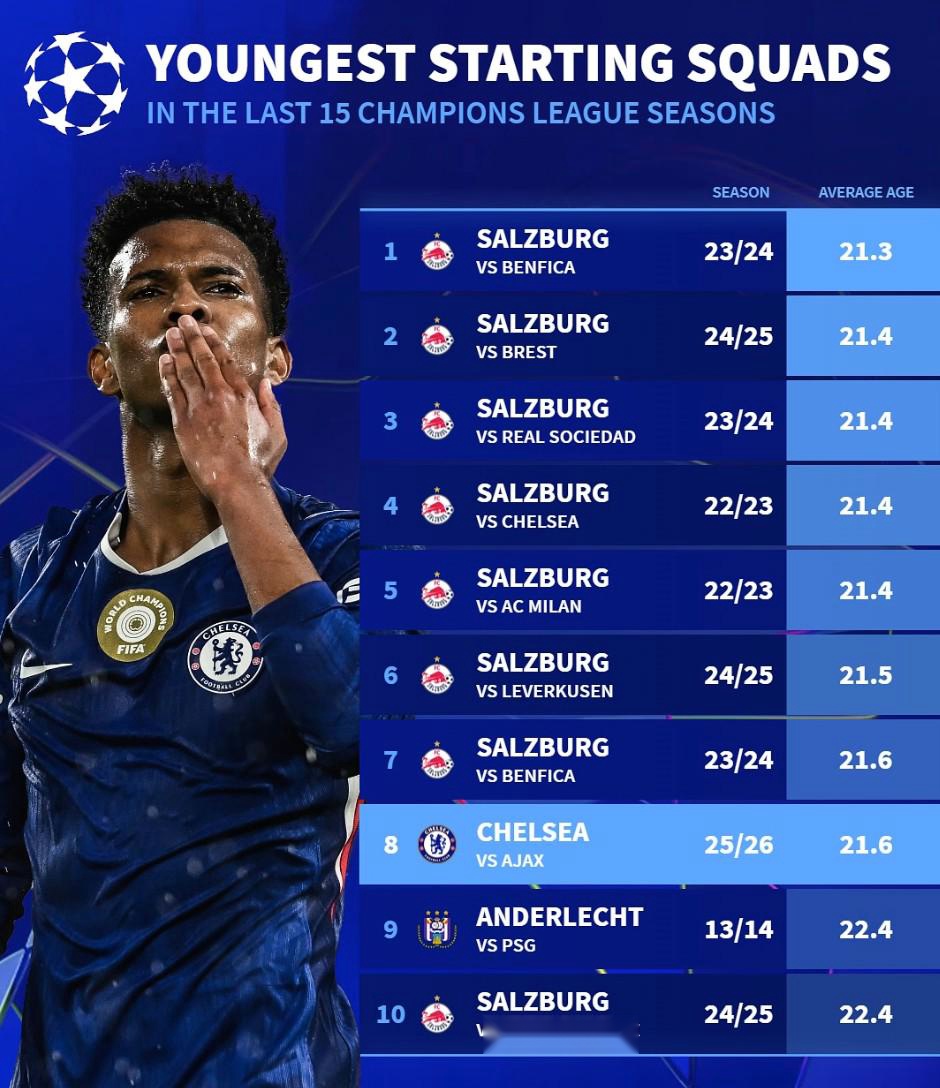 平均21.6歲,切爾西對(duì)賈府首發(fā)為歐冠近15個(gè)賽季第8年輕