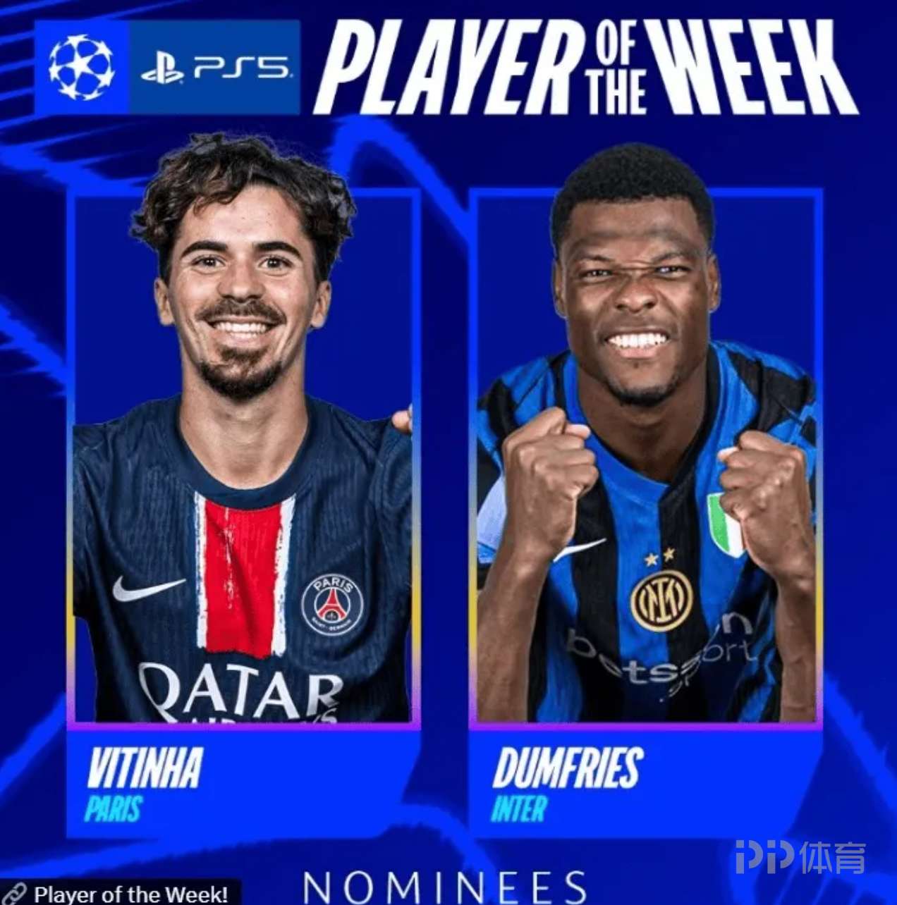 二選一!歐冠本周最佳球員候選:維蒂尼亞、鄧弗里斯