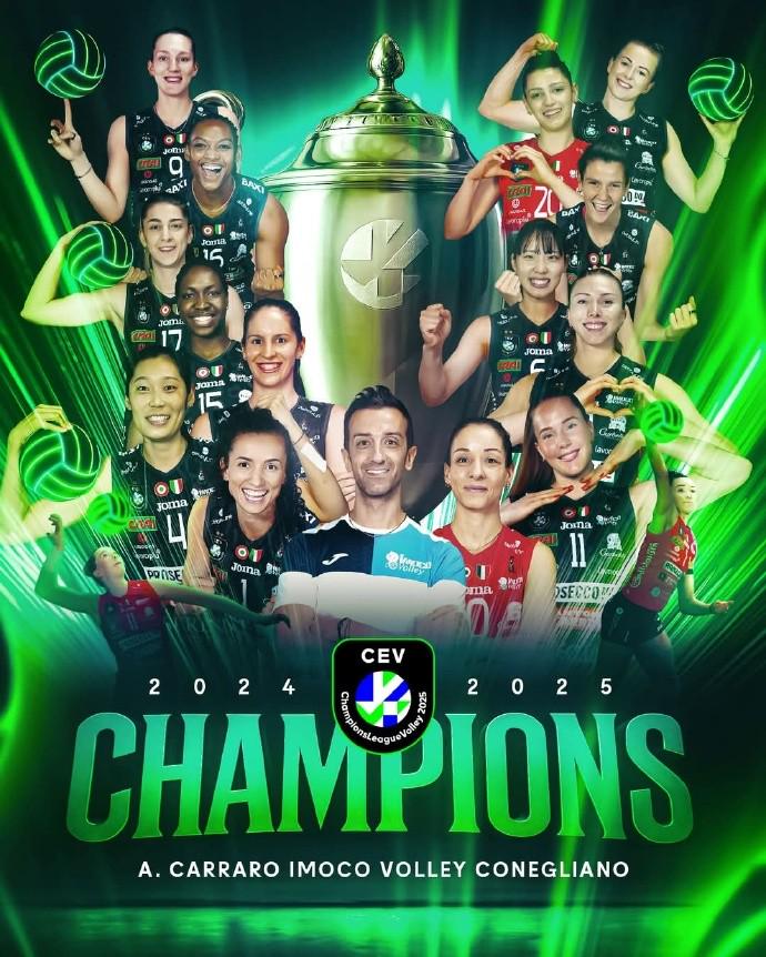 北京時間5月5日,2024-2025賽季女排歐冠決賽上演意大利德比,科內(nèi)利亞諾直落三局3-0(25-16 25-21 25-19)橫掃斯坎迪奇,成功衛(wèi)冕。