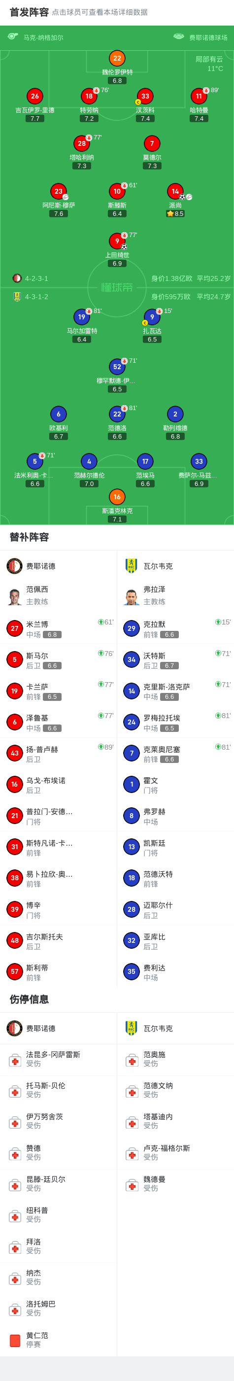 北京時(shí)間5月15日,荷蘭甲級(jí)聯(lián)賽第33輪,費(fèi)耶諾德主場(chǎng)迎戰(zhàn)瓦爾韋克。比賽中,費(fèi)耶諾德憑借派尚的進(jìn)球取得領(lǐng)先,隨后上田綺世再下一城擴(kuò)大優(yōu)勢(shì)。最終,費(fèi)耶諾德以2-0戰(zhàn)勝瓦爾韋克。 精彩瞬間 上半場(chǎng)補(bǔ)時(shí)第4分鐘,費(fèi)耶諾德球員阿尼斯-穆薩助攻派尚打入一球。 第69分鐘,費(fèi)耶諾德球員派尚助攻上田綺世打入一球。 球隊(duì)陣容 技術(shù)統(tǒng)計(jì) ![]() |