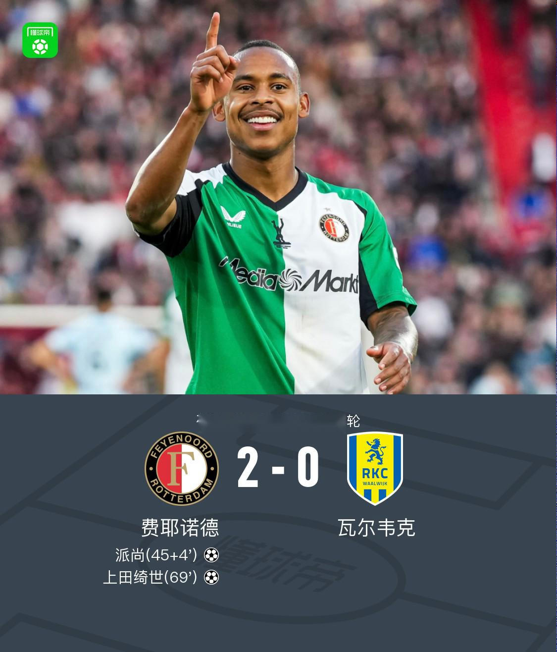 費(fèi)耶諾德2-0瓦爾韋克鎖定歐冠附加賽資格,派尚傳射,上田綺世破門