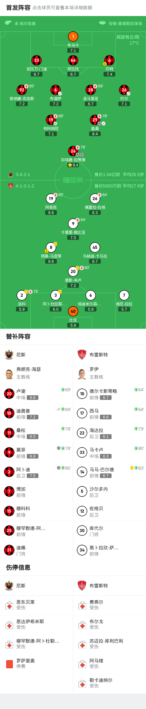 尼斯6-0狂勝布雷斯特進(jìn)入歐冠資格賽區(qū),加埃唐-拉博德雙響