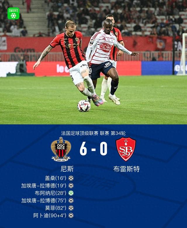 北京時(shí)間5月18日,法國足球頂級(jí)聯(lián)賽第34輪,尼斯主場迎戰(zhàn)布雷斯特。比賽中,尼斯展現(xiàn)了強(qiáng)大的進(jìn)攻火力。蓋桑率先建功,隨后助攻加埃唐-拉博德完成首開記錄,加埃唐-拉博德再入一球?qū)崿F(xiàn)梅開二度。布阿納尼通過點(diǎn)球?yàn)榍蜿?duì)擴(kuò)大優(yōu)勢,莫菲在進(jìn)攻中錦上添花,阿卜迪則在比賽尾聲階段鎖定勝局。最終,尼斯以6-0戰(zhàn)勝布雷斯特。 精彩瞬間 第16分鐘,尼斯球員布道伊助攻蓋桑打入一球。 第19分鐘,尼斯球員蓋桑助攻加埃唐-拉博德打入一球。 第28分鐘,尼斯球員布阿納尼罰入點(diǎn)球。 第75分鐘,尼斯球員巴爾助攻加埃唐-拉博德打入一球。 第82分鐘,尼斯球員迪奧普助攻莫菲打入一球。 下半場補(bǔ)時(shí)第4分鐘,尼斯球員阿卜迪打入一球。 球隊(duì)陣容 技術(shù)統(tǒng)計(jì) ![]() |