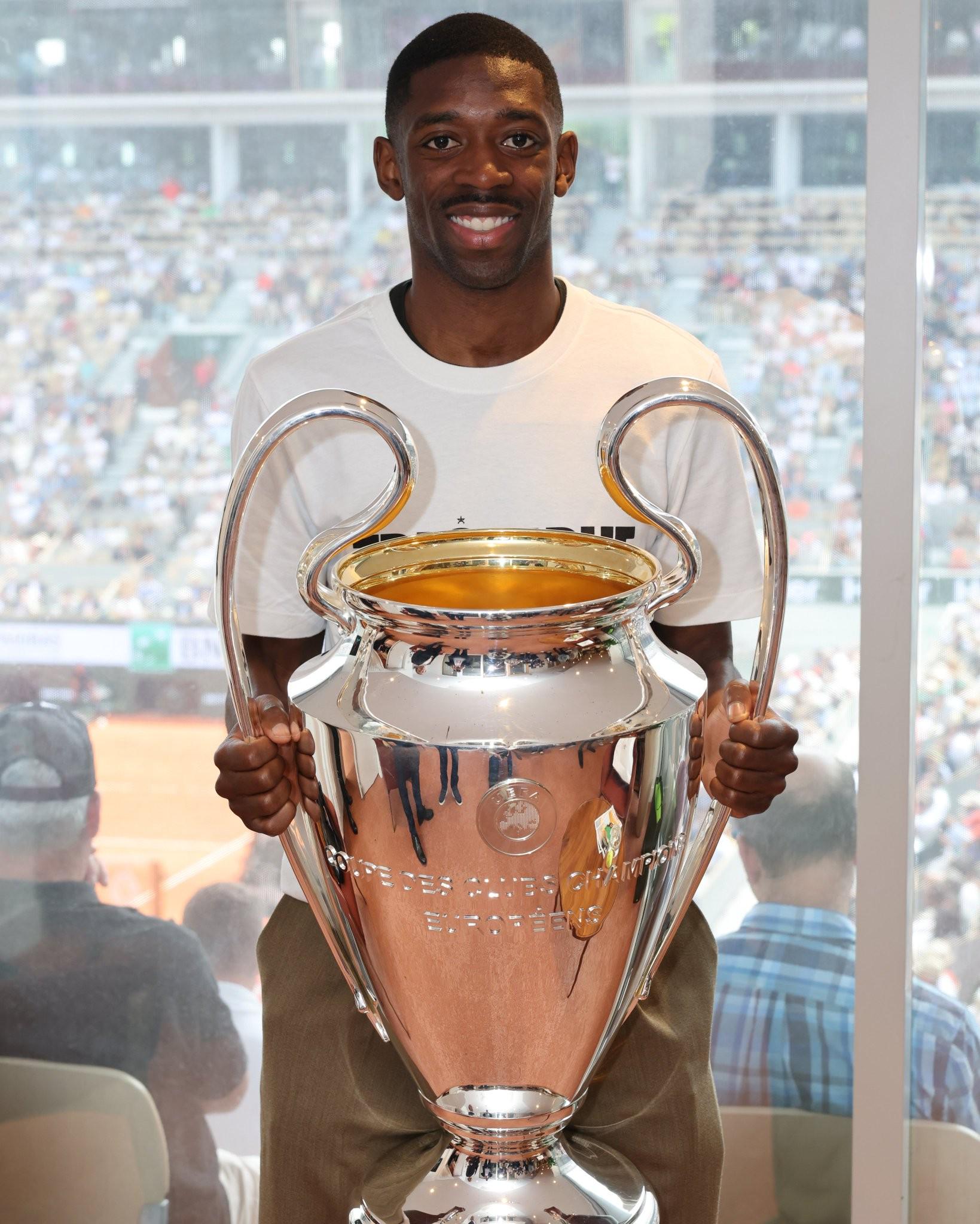 帶獎杯來看網(wǎng)球了,法網(wǎng)官方曬登貝萊手捧歐冠獎杯照片