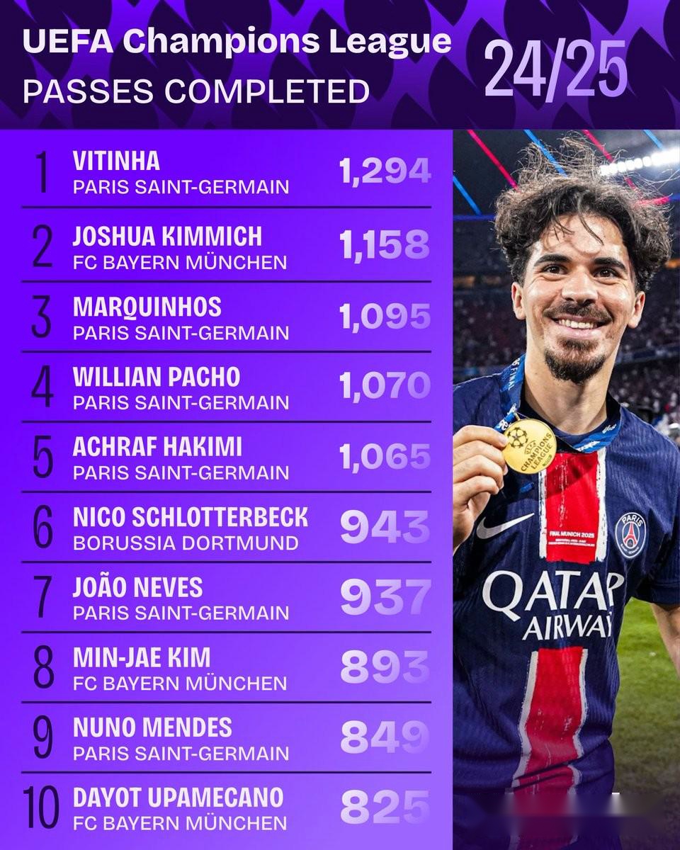 24/25賽季歐冠完成傳球榜:維蒂尼亞1294次高居榜首,基米希第二