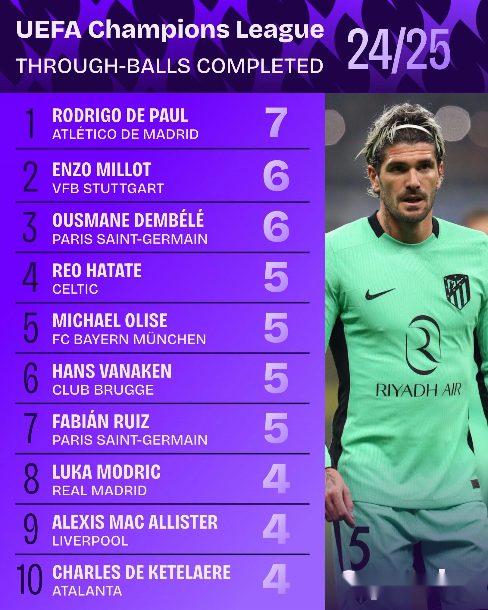 24/25賽季歐冠完成直塞榜:德保羅7次居首,登貝萊6次列次席