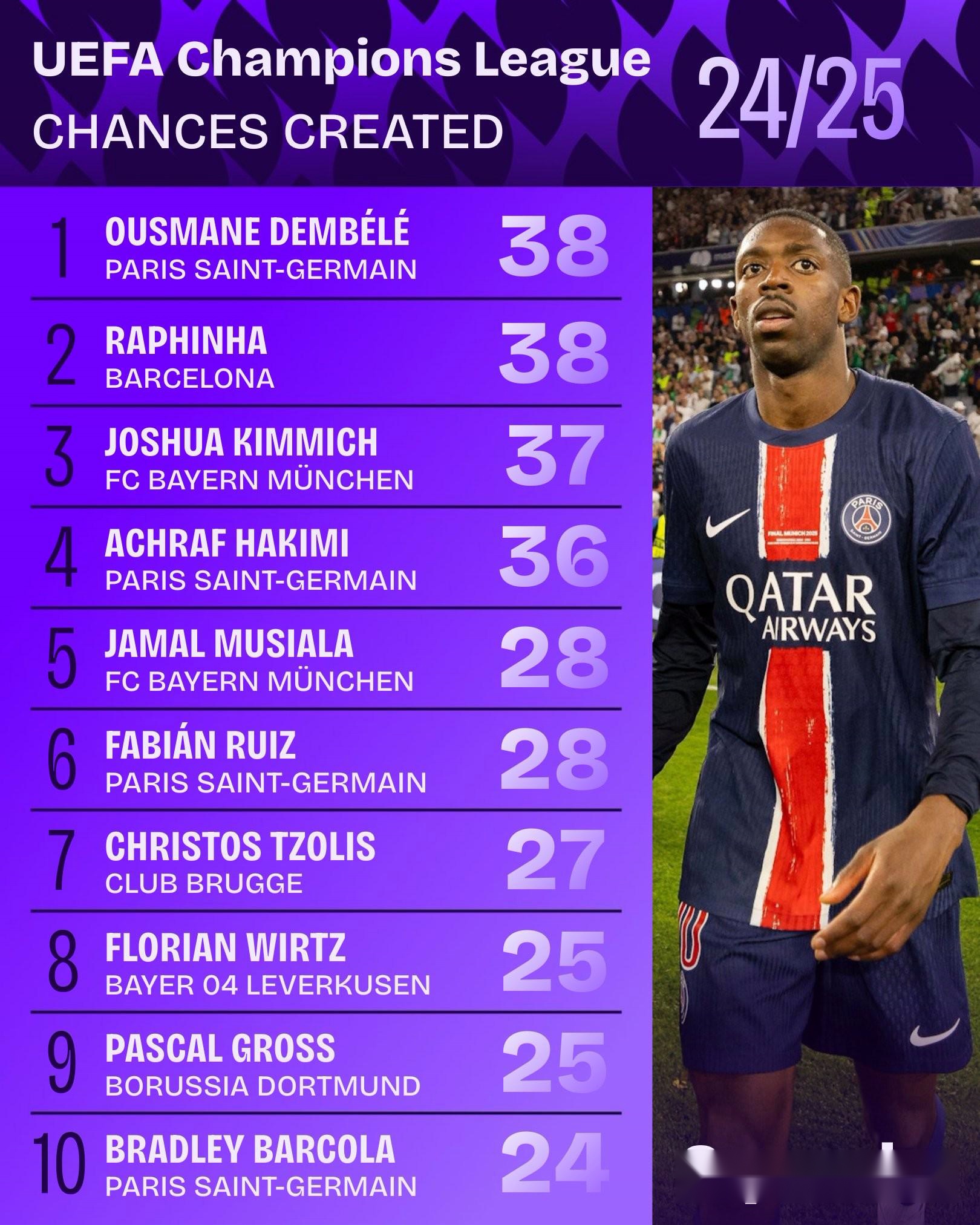 24/25賽季歐冠創(chuàng)造機(jī)會(huì)榜:登貝萊和拉菲尼亞以38次并列榜首