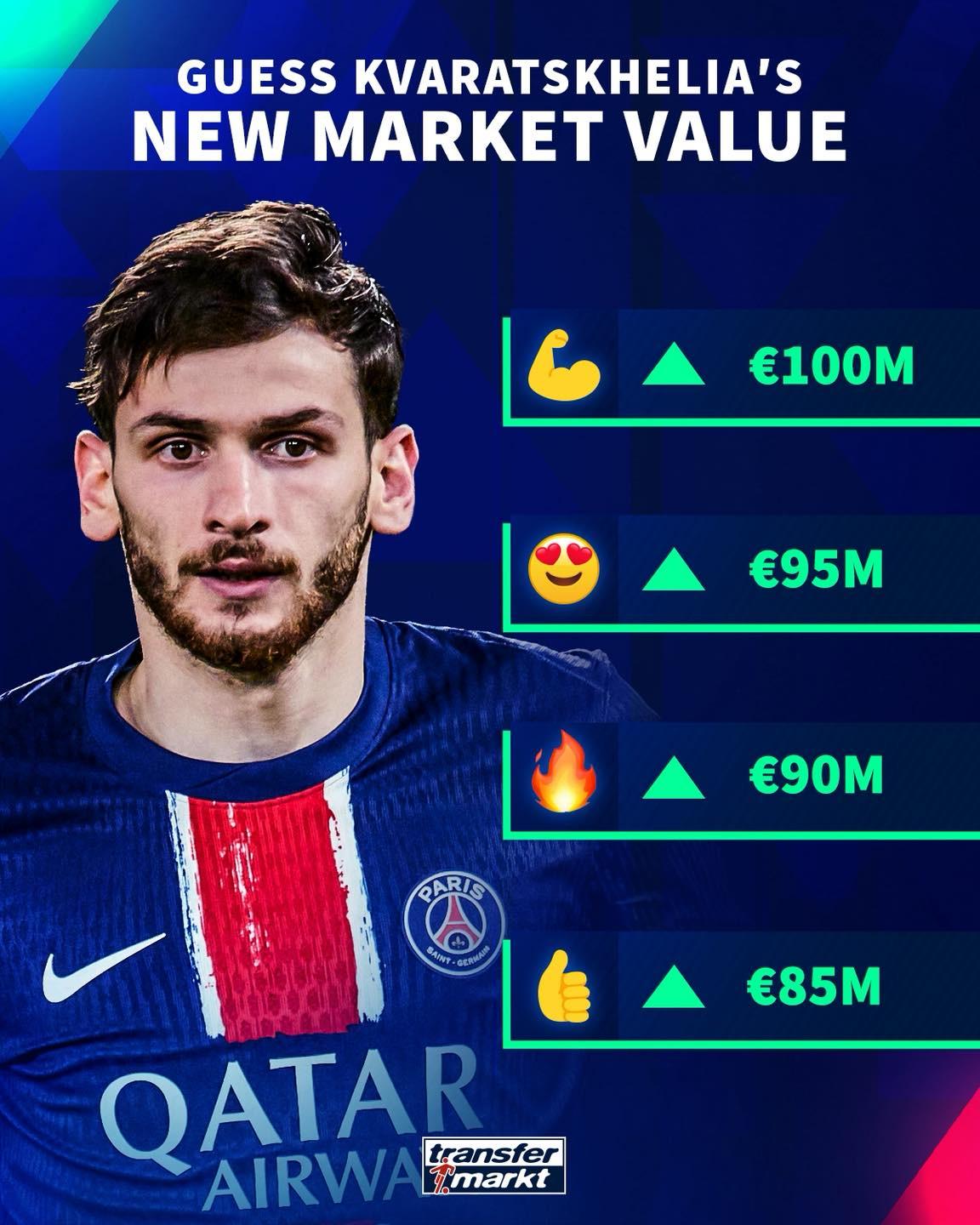 德國轉(zhuǎn)會市場網(wǎng)站在身價更新發(fā)布前預(yù)熱克瓦拉茨赫利亞身價上漲,給出四個可能的結(jié)果,分別為8500萬歐、9000萬歐、9500萬歐和1億歐。 |