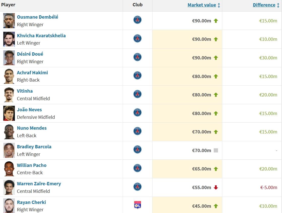 德轉(zhuǎn)更新法甲身價(jià):大巴黎包攬前十,杜埃上升3000萬并列第一