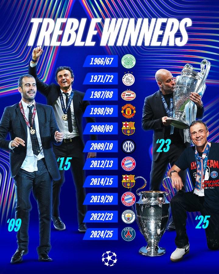 | 在上周末的歐冠決賽中,巴黎5-0擊敗國(guó)米奪冠,贏得了三冠王。   周二,歐冠官方在社交媒體上曬出了歷史上贏得三冠王球隊(duì)的海報(bào),其中恩里克、瓜迪奧拉兩度上榜。 凱爾特人 66-67賽季 喬克-斯坦 阿賈克斯 71-72賽季 克魯伊夫 埃因霍溫 87-88賽季 希丁克 曼聯(lián) 98-99賽季 弗格森 巴薩 08-09賽季 瓜迪奧拉 國(guó)米 09-10賽季 穆里尼奧 拜仁 12-13賽季 海因克斯 巴薩 14-15賽季 恩里克 拜仁 19-20賽季 弗里克 曼城 22-23賽季 瓜迪奧拉 巴黎 24-25賽季 恩里克 |
